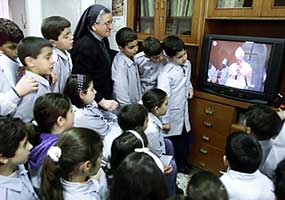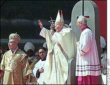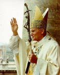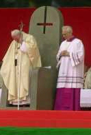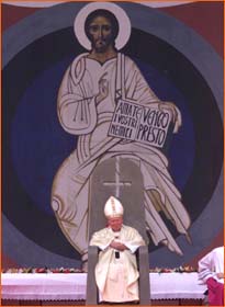 The following pictures are quite informative. Mr. Pope visited Israel in March 2000. He sat at an altar at Korazim, Israel. Notice the pictures and take heavy notice at the upside down Satanic cross on the chair-back itself. Oooops... true colors are showing!